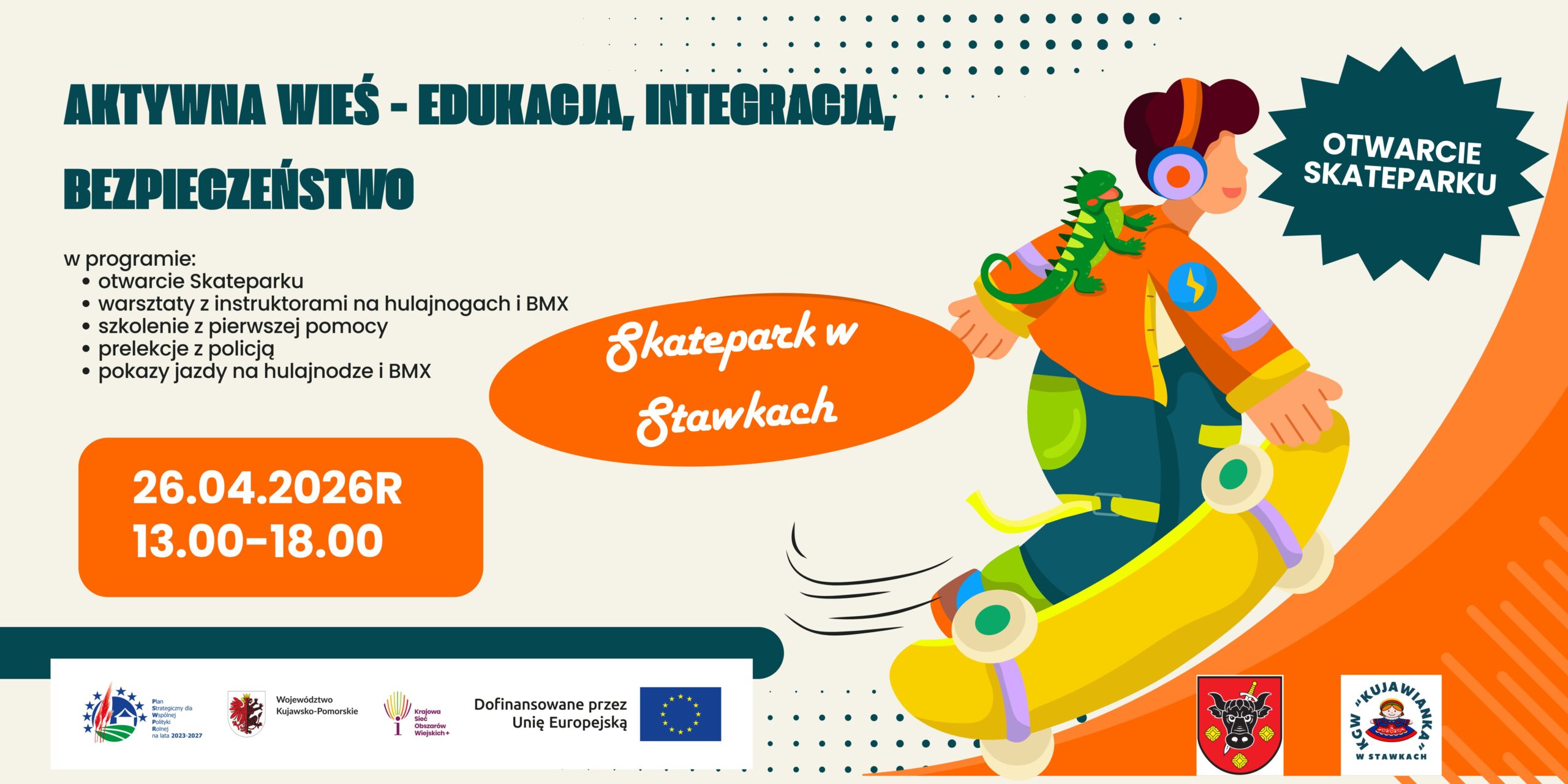 Zapraszamy na imprezę plenerową pn. „Aktywna Wieś – edukacja, integracja, bezpieczeństwo”, która odbędzie się w dniu 20 kwietnia 2026 r.  w  Stawkach (gm. Aleksandrów Kujawski), Skatepark, ul. Sportowa.