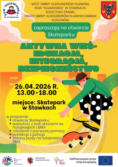 Zapraszamy na imprezę plenerową pn. „Aktywna Wieś – edukacja, integracja, bezpieczeństwo”, która odbędzie się w dniu 20 kwietnia 2026 r. w Stawkach (gm. Aleksandrów Kujawski), Skatepark, ul. Sportowa. Współorganizatorem jest Koło Gospodyń Wiejskich „Kujawianka”. Program wydarzenia: 13:00-13:30 Otwarcie wydarzenia 13:30-15:00 Warsztaty skatepark – hulajnoga (grupa I) Warsztaty skatepark – BMX (grupa II) 14:00-15:00 […]